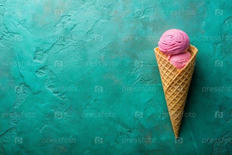 Сладкий десерт. Стильная современная концепция. Розовый мороженый конус на ярком бирюзовом фоне. Всемирный день мороженого