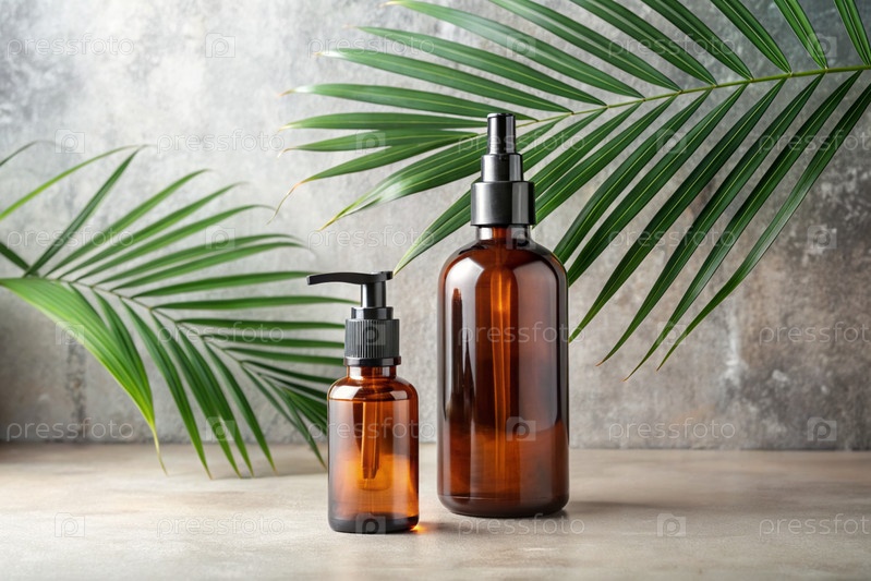 Ароматерапия.Стеклянная бутылка с пипетой для масла, лосьона и пальмовых листьев на бетонном фоне.Натуральная органическая экокосметика.Модель корпоративного стиля салона красоты