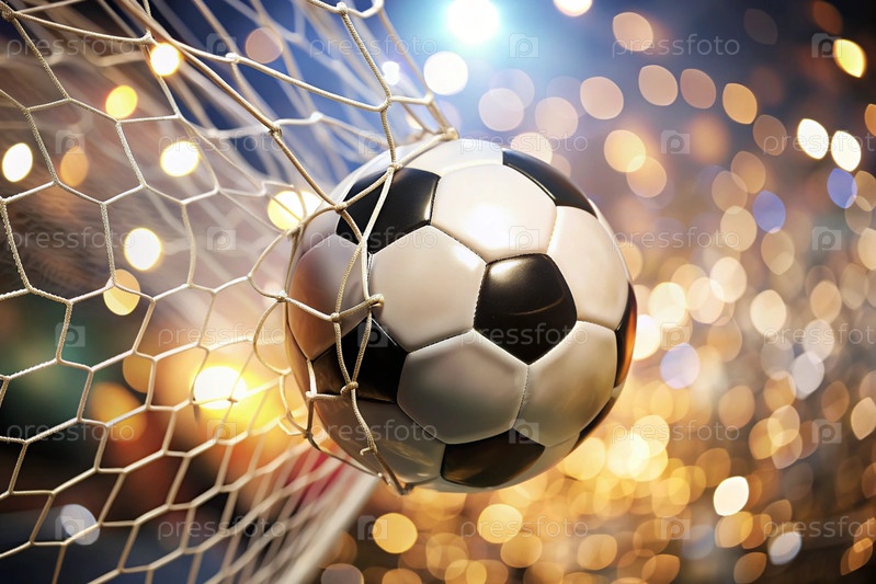 Футбольный мяч в ворота, среди сверкающих огней и размытого фона