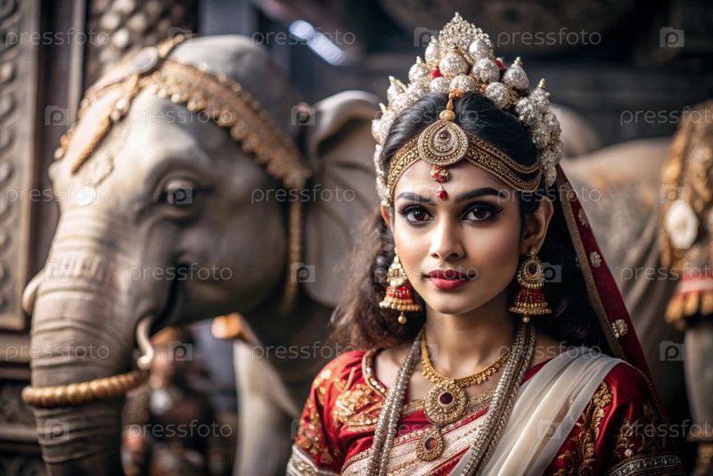 Красивая индийская девушка в традиционном национальном костюме, сари. со слонами. портрет символизирует традиции, культуру и красоту народа Индии