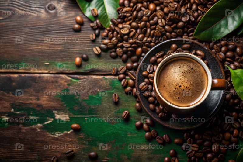 Чашка освежающего черного кофе и кофейных зерен на старом зеленом столе