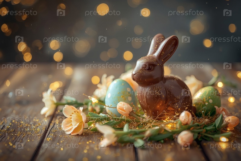Шоколадное пасхальное яйцо, шоколадный кролик и весенние цветы на деревянном фоне. Пасхальные сладости и лакомства. Концепция яркого праздника Пасхи в 2026 году. Хорошая открытка