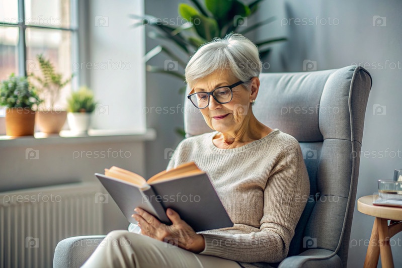 Пожилая пенсионерка, современная бабушка в очках, читает книгу во внутренней части гостиной, сидя на стуле дома при естественном свете