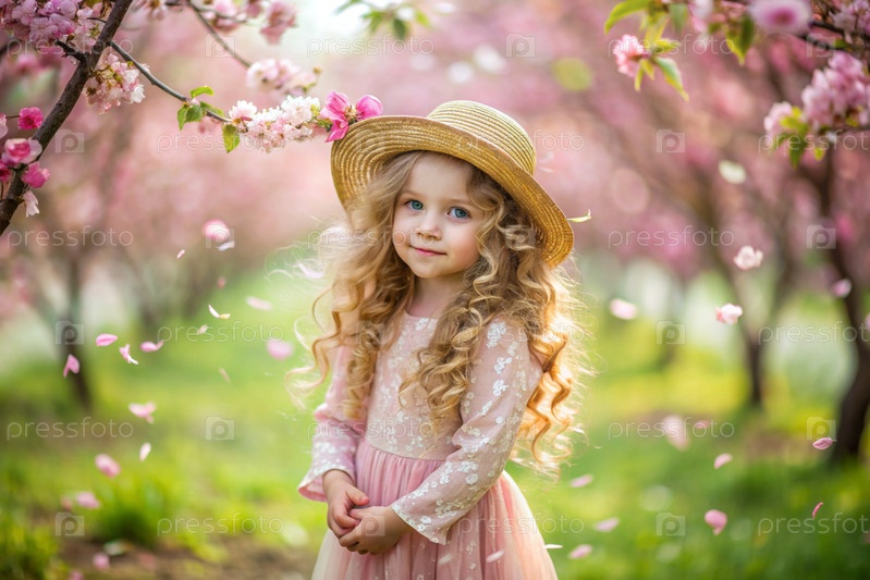 Портрет красивой маленькой кудрявой 4-летней девочки в соломенной шляпе и платье в цветущем розовом саду яблок. Детство. Ребенок позирует и смотрит на камеру