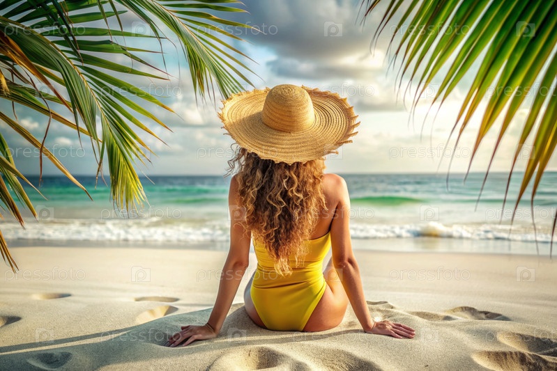 Женщина на отдыхе, сидящая в купальнике и соломенной шляпе с широкими краями на пляже в солнечный день и смотрящая на море
