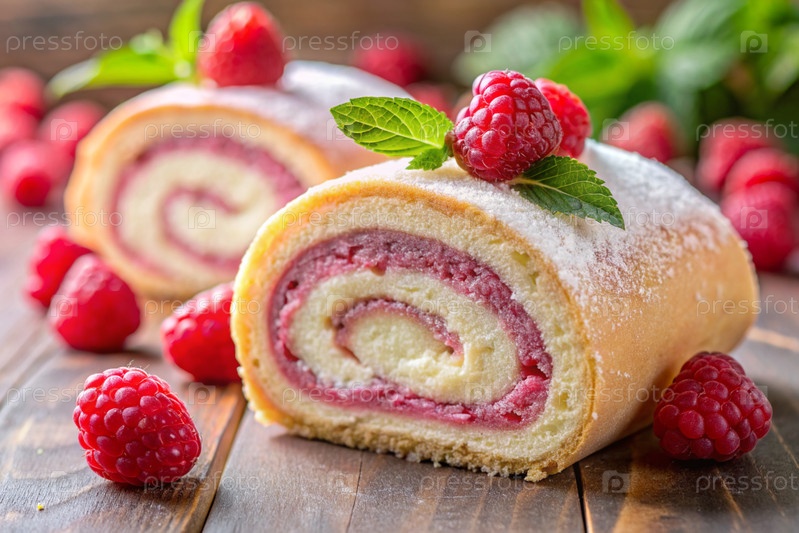 Швейцарская губка с малиной, вкусный фруктовый и сливочный десерт наполненный кремовым сыром, украшенный свежими малинами