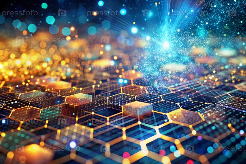 Высокотехнологичный материал. Близкий план клеточного рисунка с многоцветными огнями, создавая абстрактный и футуристический дизайн. Концепция развития и технологии будущего