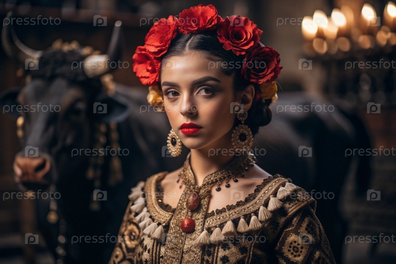 Испанская девушка в традиционном испанском национальном костюме. Перед быком. Бикоборство. Портрет символизирует традиции и культуру народа Испании