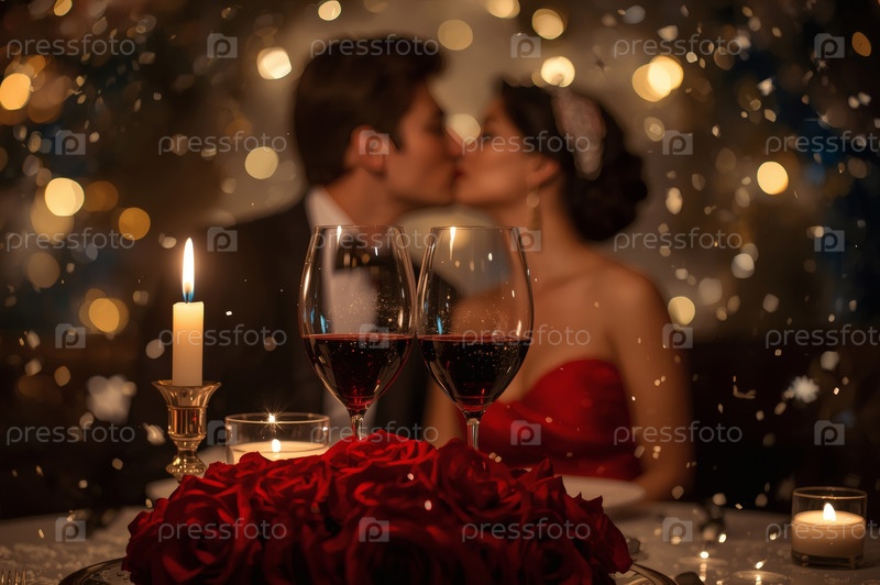 Концепция Дня святого Валентина: элегантная пара, целующаяся на романтическом ужине при свечах с бокалами вина в роскошный вечер