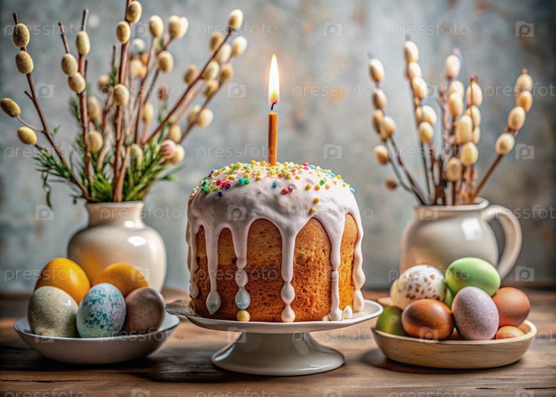 Православный Пасхальный торт, окрашенные яйца, иконы, лица святых, цветы, церковные свечи и пасхальное украшение на деревянном столе в старом деревенском доме