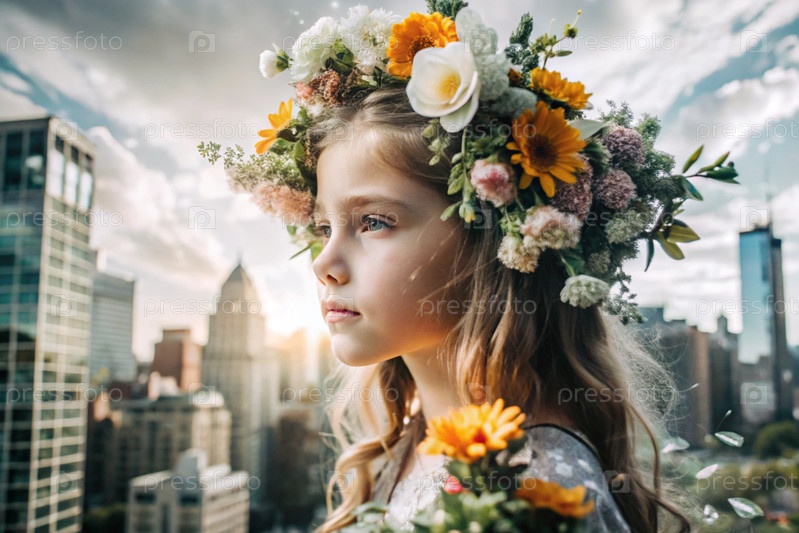 Портрет молодой девушки. концептуальный художественный крупнометражный снимок на фоне городского фона с двойной экспозицией и визуальными эффектами