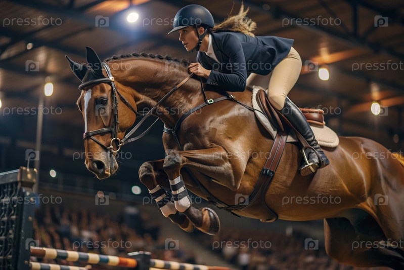 Близкий план олимпийской лошади и всадника, перепрыгивающих через препятствие на открытой арене - это конная езда
