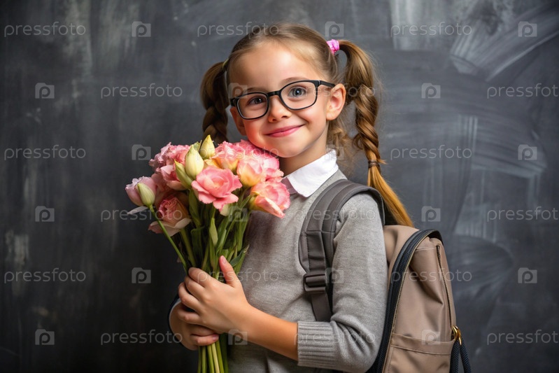 Милая, красивая первоклассница с очками. Букет цветов. Ребенок впервые идет в школу. Ребёнок с рюкзаком, книгой и цветами. Возвращение к школе