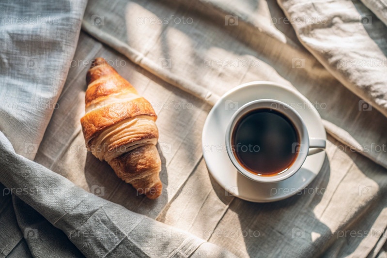 Вкусный свежевыпеченный кроассан, чашка белого кофе и хлопчатобумажная салфетка на деревянном фоне. французский завтрак. вкусная выпечка вблизи