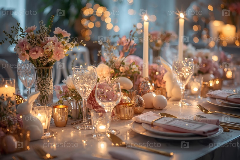 Пасхальный баннер 2026. декоративная тарелка, столовая посуда, стаканы, пасхальные яйца и кролики. концепция празднования Пасхи для кафе и ресторанов