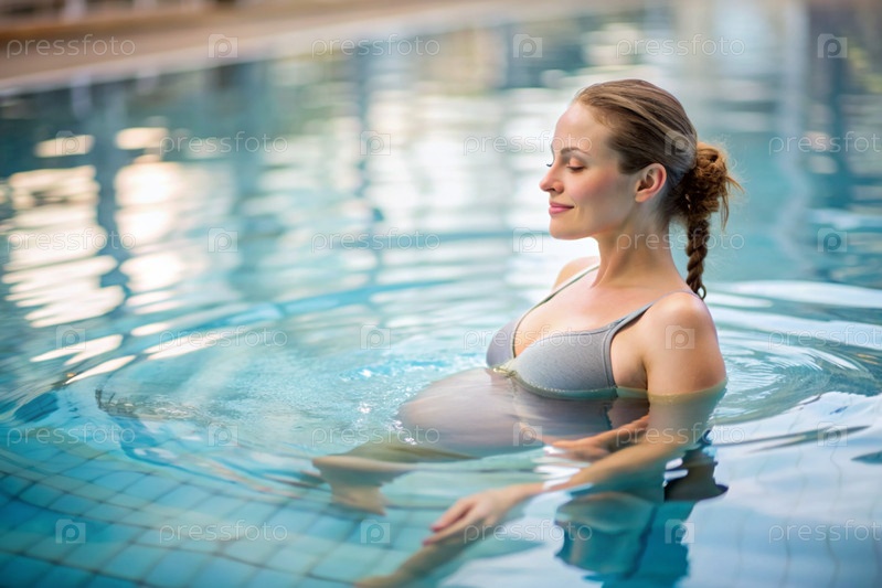 Расслабление, душевное спокойствие. Беременная красивая женщина в отопительном бассейне на открытом воздухе. Понятие беременности, родов и родительства. Здоровый образ жизни