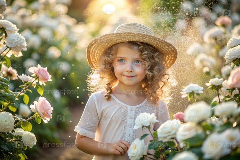Портрет красивой кудрявой девушки в соломенной шляпе и платье в цветущем розовом саду. Детство. Девочка позирует и смотрит в камеру