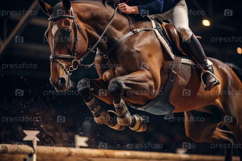Близкий план олимпийской лошади и всадника, перепрыгивающих через препятствие на открытой арене - это конная езда