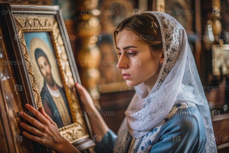 Портрет красивой молодой женщины с платками в православной церкви.Девушка молится в церкви среди икон