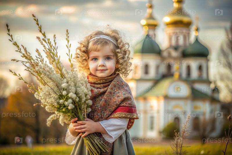 Пальмовое воскресенье. христианство. портрет трехлетней девочки в русском народном шале с ветвями ивы в руках на фоне православной церкви