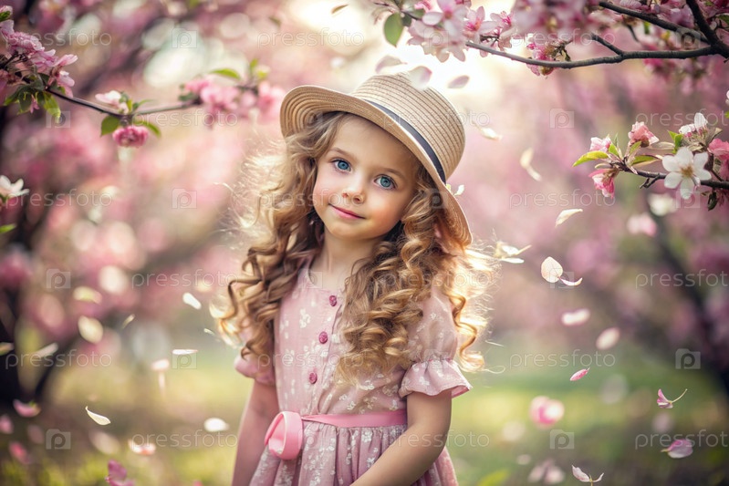 Портрет красивой маленькой кудрявой 4-летней девочки в соломенной шляпе и платье в цветущем розовом саду яблок. Детство. Ребенок позирует и смотрит на камеру