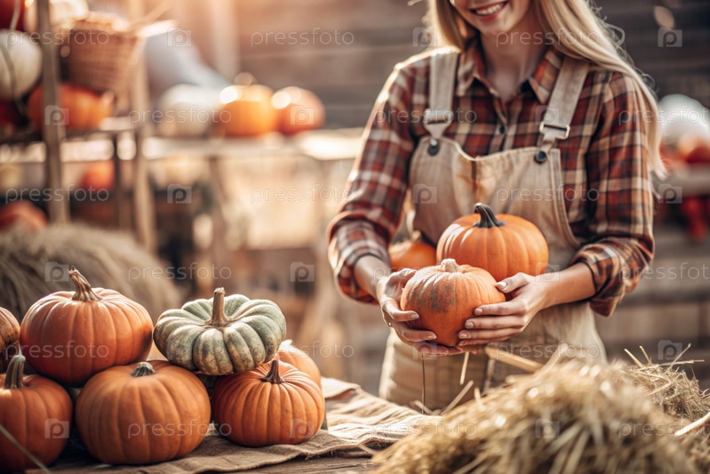 Руки женщины в квадратной рубашке с тыквенным крупным планом и красивым осенним рисунком. Сбор тыков. Концепция празднования Дня благодарения и Хэллоуина
