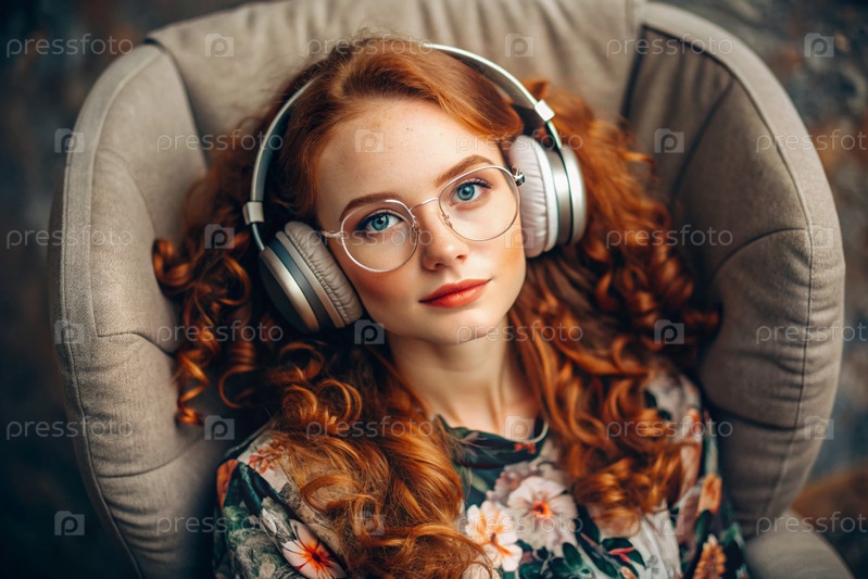 Молодая красивая рыжеволосая женщина с веснушками слушает музыку в больших беспроводных наушниках дома на стуле в гостиной
