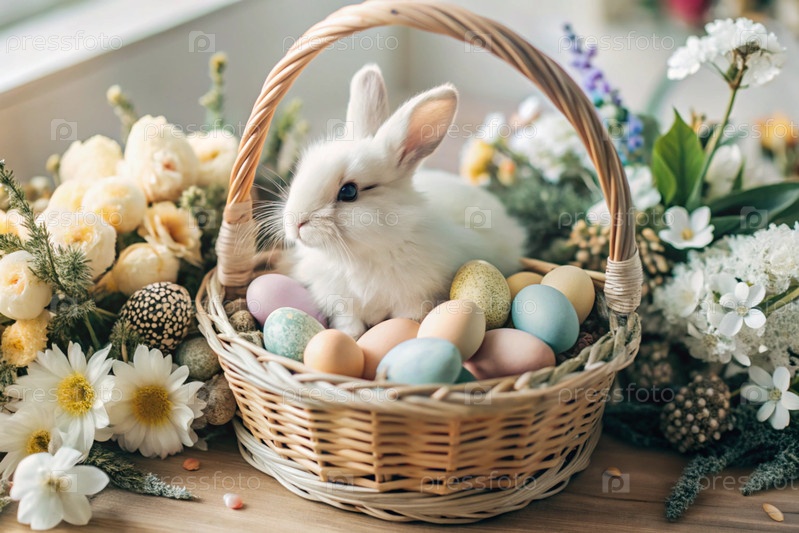 Баннер. пасхальный кролик в плетеновой корзине, наполненной красочными пасхальными яйцами. концепция весенних праздников Пасхи