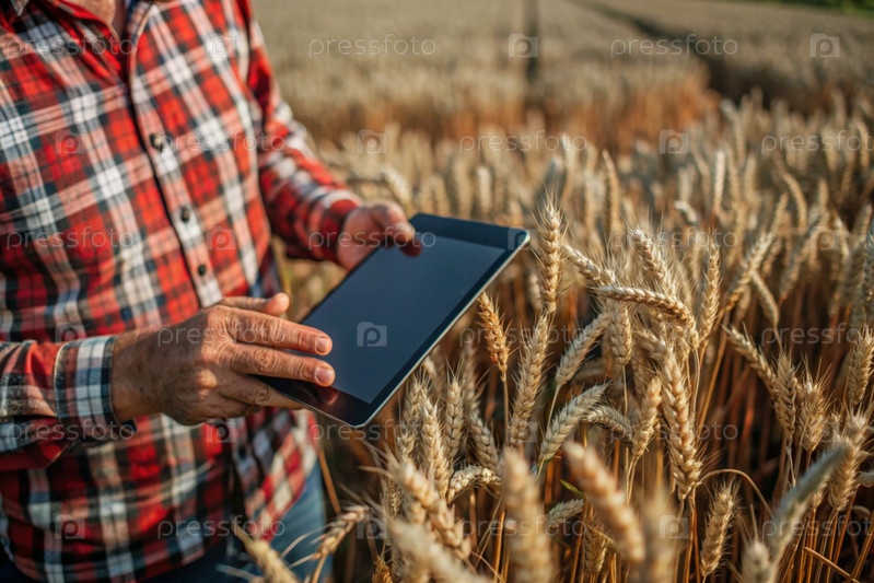 Agronom использует программное обеспечение для обработки онлайн-данных для цифрового сельского хозяйства.Фермер с планшетом в руках стоит на пшеничном поле