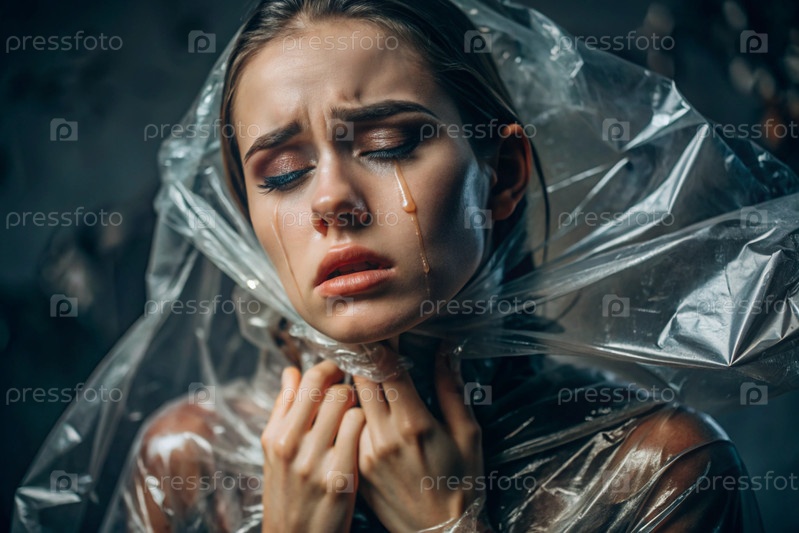 Девочка завернута в целлофан или сумку. Девушка задыхается. Пластиковое загрязнение планеты. Опасность для окружающей среды. Сокращение повторного использования пластика. Переработка. Концепция мусора
