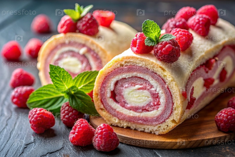 Швейцарская губка с малиной, вкусный фруктовый и сливочный десерт наполненный кремовым сыром, украшенный свежими малинами