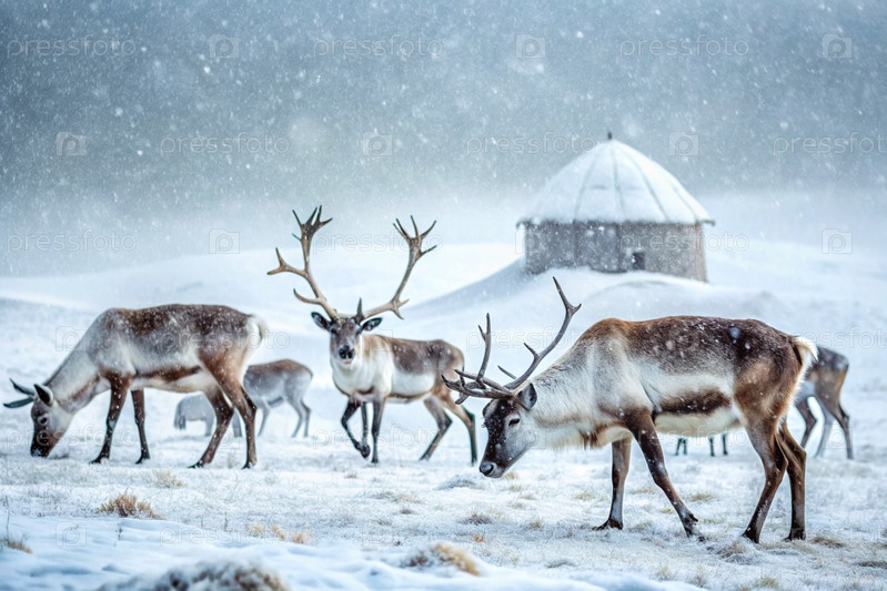 Олени пасутся против тундрового ландшафта и зимней юрты