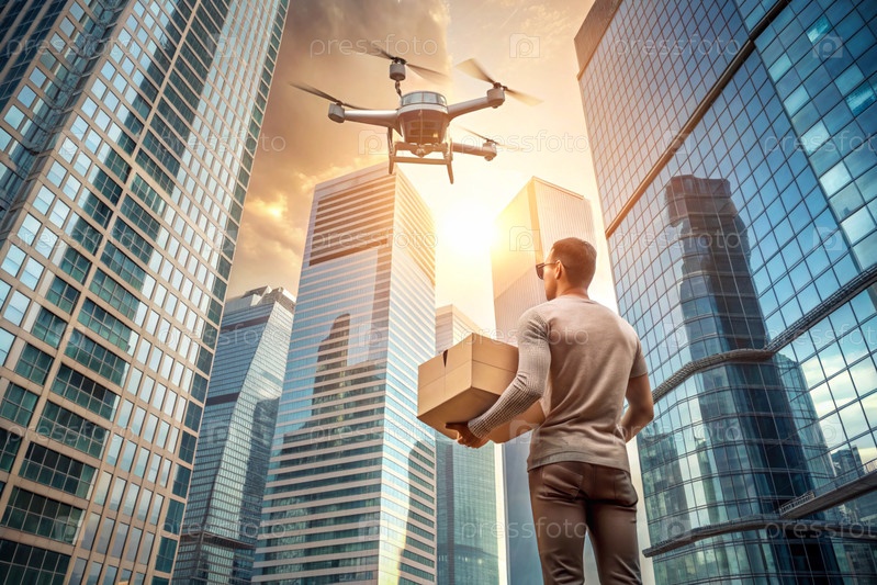 Технология будущего. Дрон доставки несет картонную коробку для человека на веревке. Дрон доставки летает между современными небоскребами. Концепция развития доставки товаров