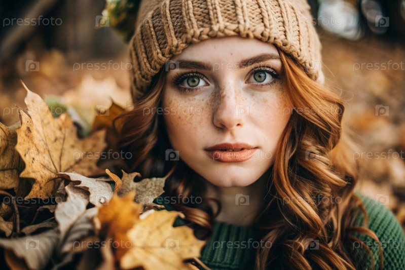 Осенний портрет. Близкий план молодой рыжеволосой женщины с выразительными зелеными глазами в вязанной шляпе и свитере