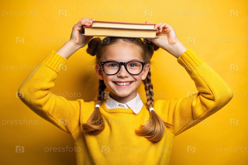 Красивая девушка с очками и книгами на голове. Ребенок впервые ходит в школу. Ребёнок на желтом монохромном фоне. Возвращение к школе