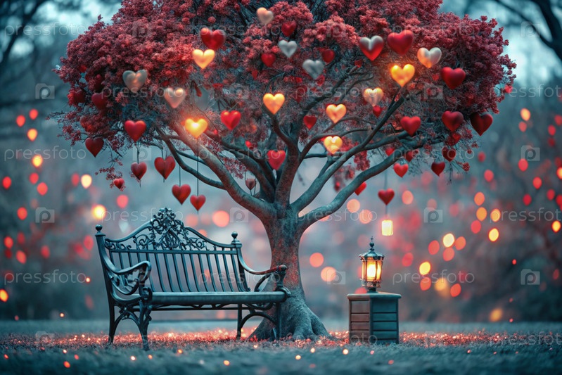 Красивое фантастическое дерево в форме сердца, сияющее среди деревьев парка и скамейка для влюбленных на сказочном фоне боке-стиля