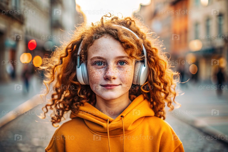 Молодая красивая кудрявая женщина слушает музыку с наушниками на вечерней улице города при закате солнца.Мир, гармония, отдых и расслабление