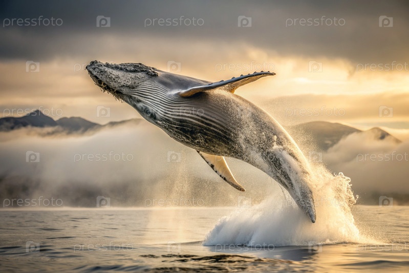 Прорыв серого горбатого кита из воды.Огромный кит выпрыгивает из воды.Киты смотрят в океане