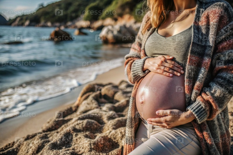 Расслабление, спокойствие, морской воздух. Закрытие живота. Беременная женщина на пляже у моря. Концепция беременности, родов и родительских обязанностей