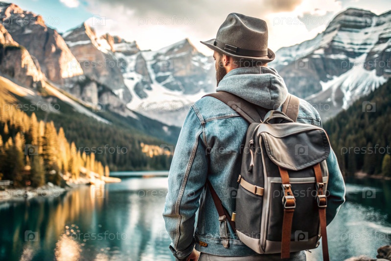 Человек с рюкзаком на спине против голубого озера в горном лесу. он путешествует и наслаждается жизнью и окружающей средой. туризм