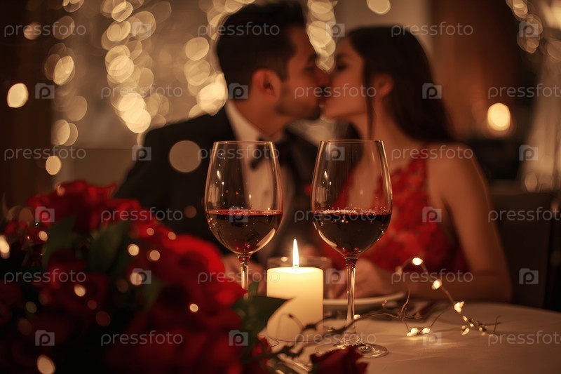 Концепция Дня святого Валентина: элегантная пара, целующаяся на романтическом ужине при свечах с бокалами вина в роскошный вечер