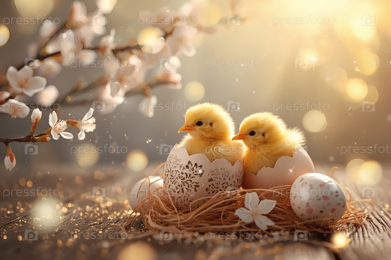 Концепция яркого Пасхального праздника. Нежные розовые пасхальные яйца, желтые курицы и вишневые ветви на деревянном фоне. Концепция ярких пасхальных праздников в 2026 году