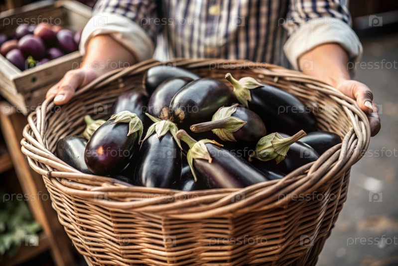 Концепция выращивания продуктов питания. свежие органические баклажаны на фермерском рынке. богатый урожай баклажан в плетеновой корзине