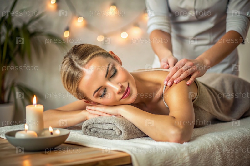Баннер для профессиональных массажных салонов.Молодая, красивая блондинка наслаждается массажем в современном спа при свечах.Освобождение и гармония, уход за телом