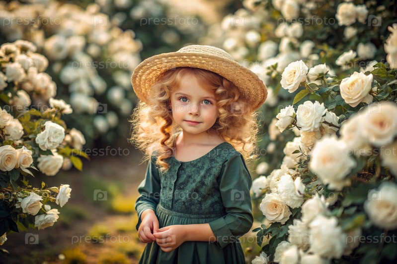 Портрет красивой кудрявой девушки в соломенной шляпе и платье в цветущем розовом саду. Детство. Девочка позирует и смотрит в камеру