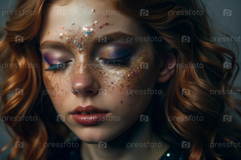 Покрытие лица девушки праздничным макияжем и ленточками.Изображение придает ей сказочный и мистический вид.Концепция новогодней ночи или дня рождения