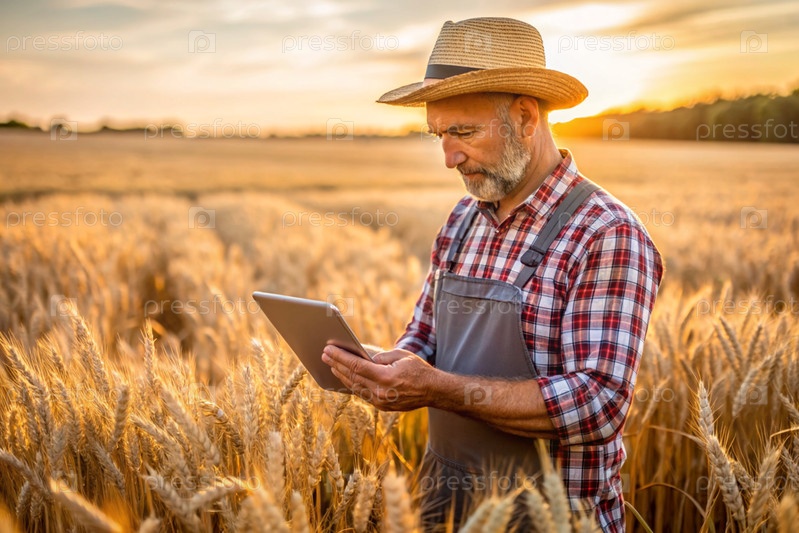 Agronom использует программное обеспечение для обработки онлайн-данных для цифрового сельского хозяйства.Фермер с планшетом в руках стоит на пшеничном поле