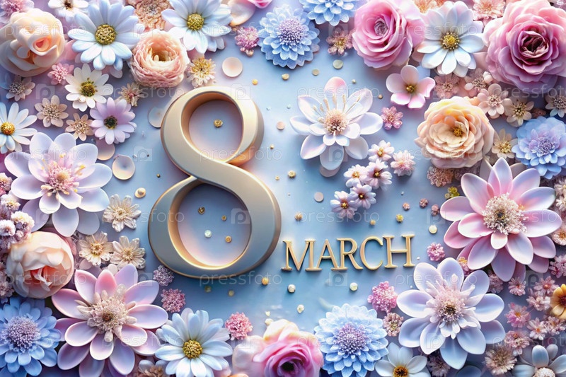 Международный женский день. Баннер, флаер. Праздничный, нежный цветочный фон в голубых и розовых тонах с номером 8