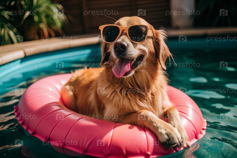 В бассейне плавает счастливый золотой ретривер в розовых очках на розовом надувном кольце.Концепция дружественного отдыха для домашних животных