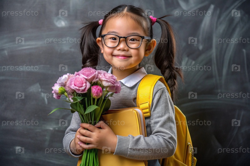 Первоклассный азиат с очками на доске. Девушка держит цветы в руках. Ребенок пойдет в школу впервые. Ребёнок с рюкзаком, книгой и цветами. Возвращение к школе